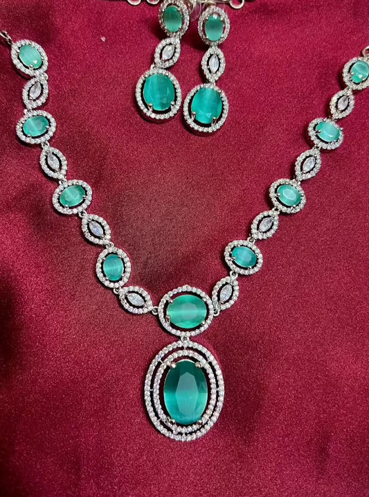 American Diamond Turquoise Blue Silver Necklace Set DB-AD1948Z10