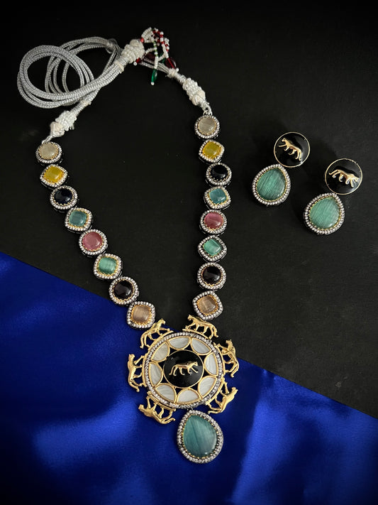Sabyasachi Inspired Premium Lion Jaguar Multicolour Gemstone Long Necklace Set DB-SS13050Z4