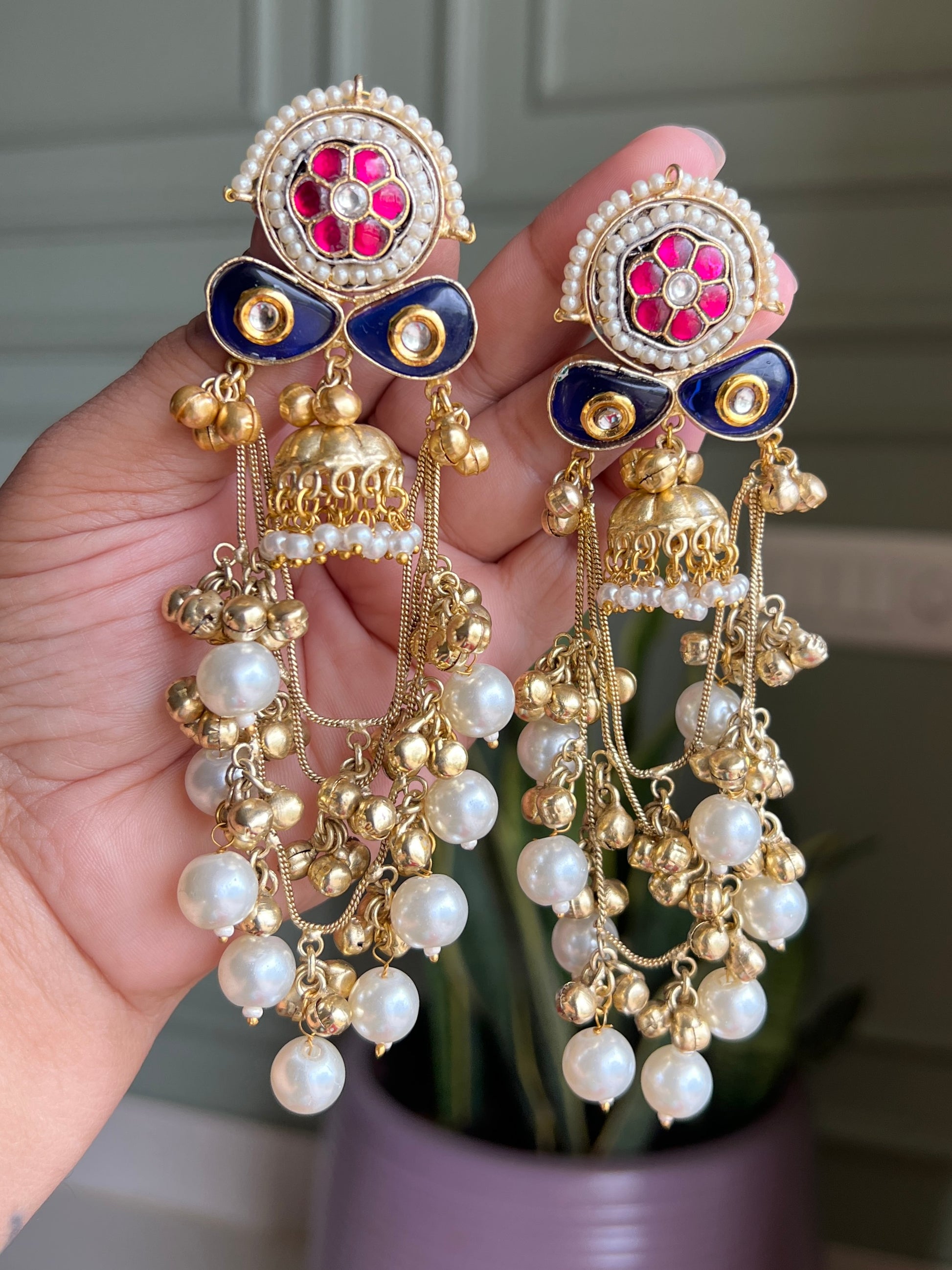 Meet Mira, the earrings with personality! These sassy danglers feature a party of pachi kundan, pearls, monalisa stones, and ghungroos that jingle with joy. Crafted from brass but light as a whisper, they'll have you forgetting they're even there—until the compliments start rolling in! Their eye-popping colors and one-of-a-kind design make them the perfect playmates for your sarees, salwar suits, or lehengas. Who said traditional can't be fun?
