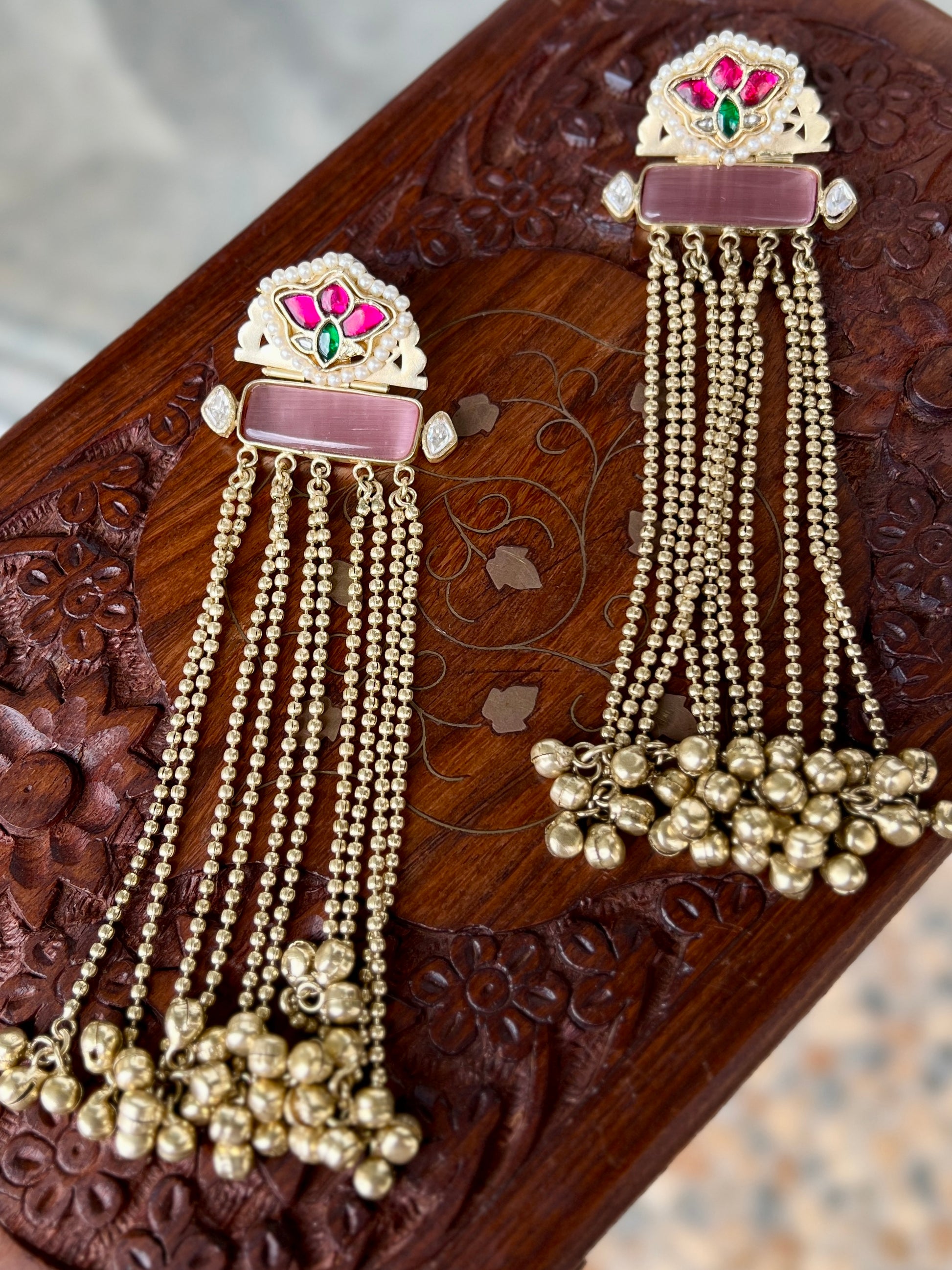 Dance into any occasion with our Prachi Kundan Tassels Earrings! These playful danglers feature exquisite Pachi Kundan work paired with lustrous pearls that catch every light. Surprisingly lightweight despite their statement length, they swing and sway with your every move while the cheerful ghungroo beads add a delightful musical touch. Perfect for adding a splash of fun to both casual and festive looks!