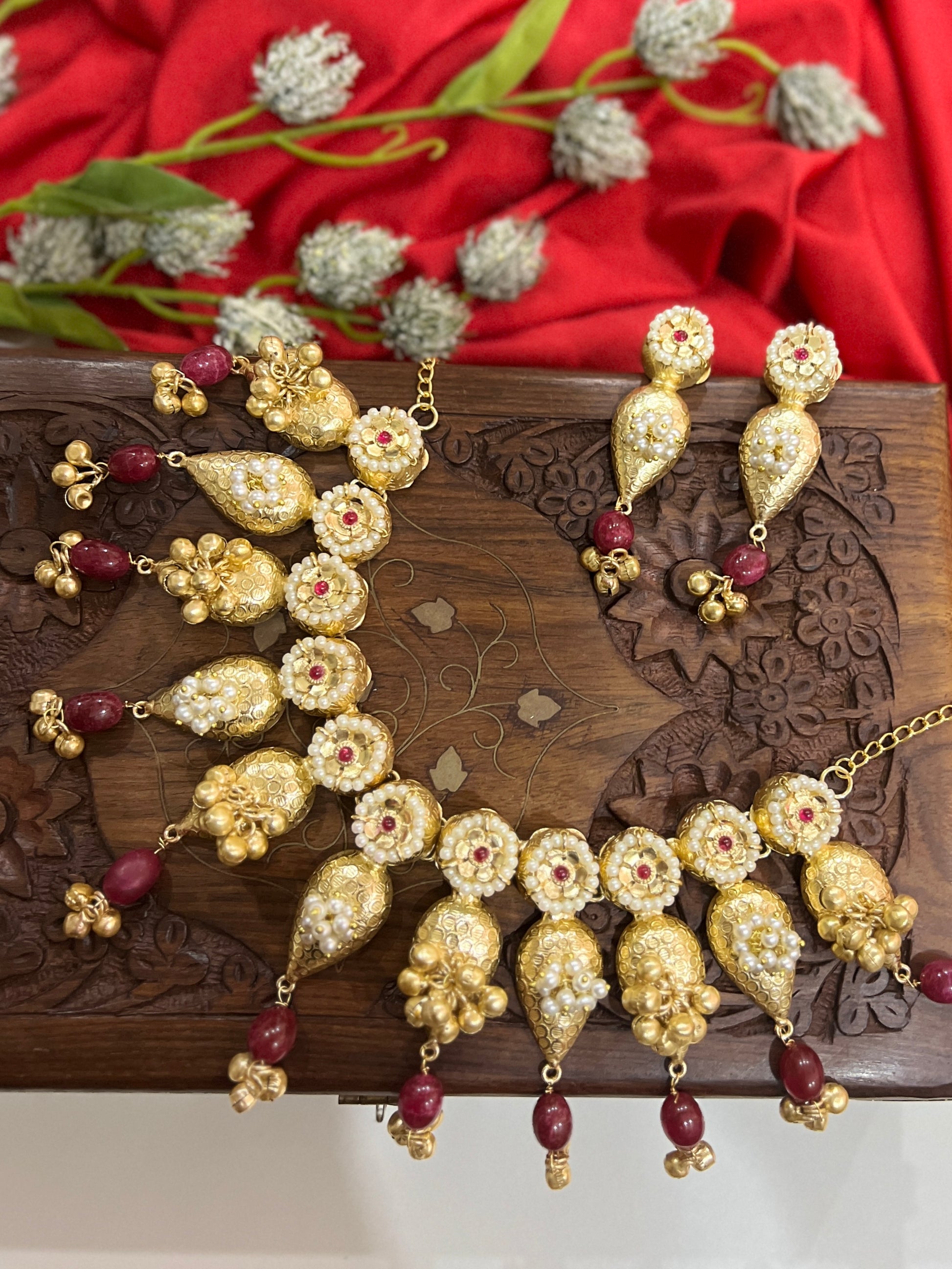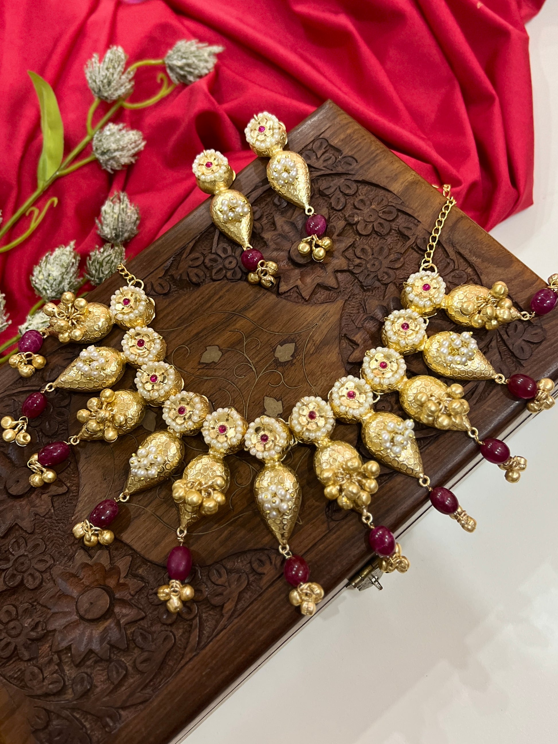 The Rohini Necklace Set features expertly handcrafted gold-plated elements complemented by rich maroon beads. Traditional ghungroo bells provide subtle acoustic enhancement, while strategic pearl accents create visual dimension. This piece exemplifies authentic traditional craftsmanship with meticulous attention to detail.